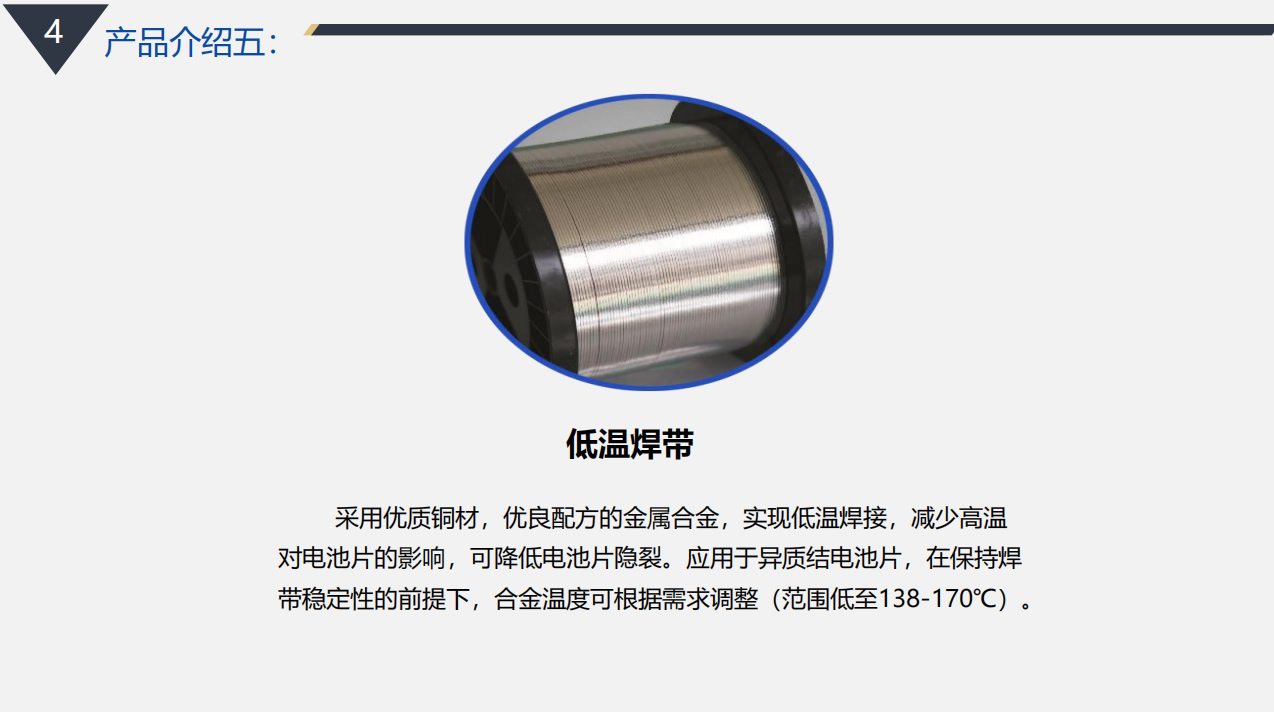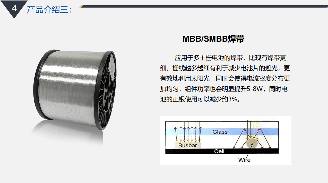 匯流帶 黑色焊帶/沖孔焊帶 MBB/SMBB焊帶 低電阻焊帶 低溫焊帶 反光焊帶 微細圓形焊帶
